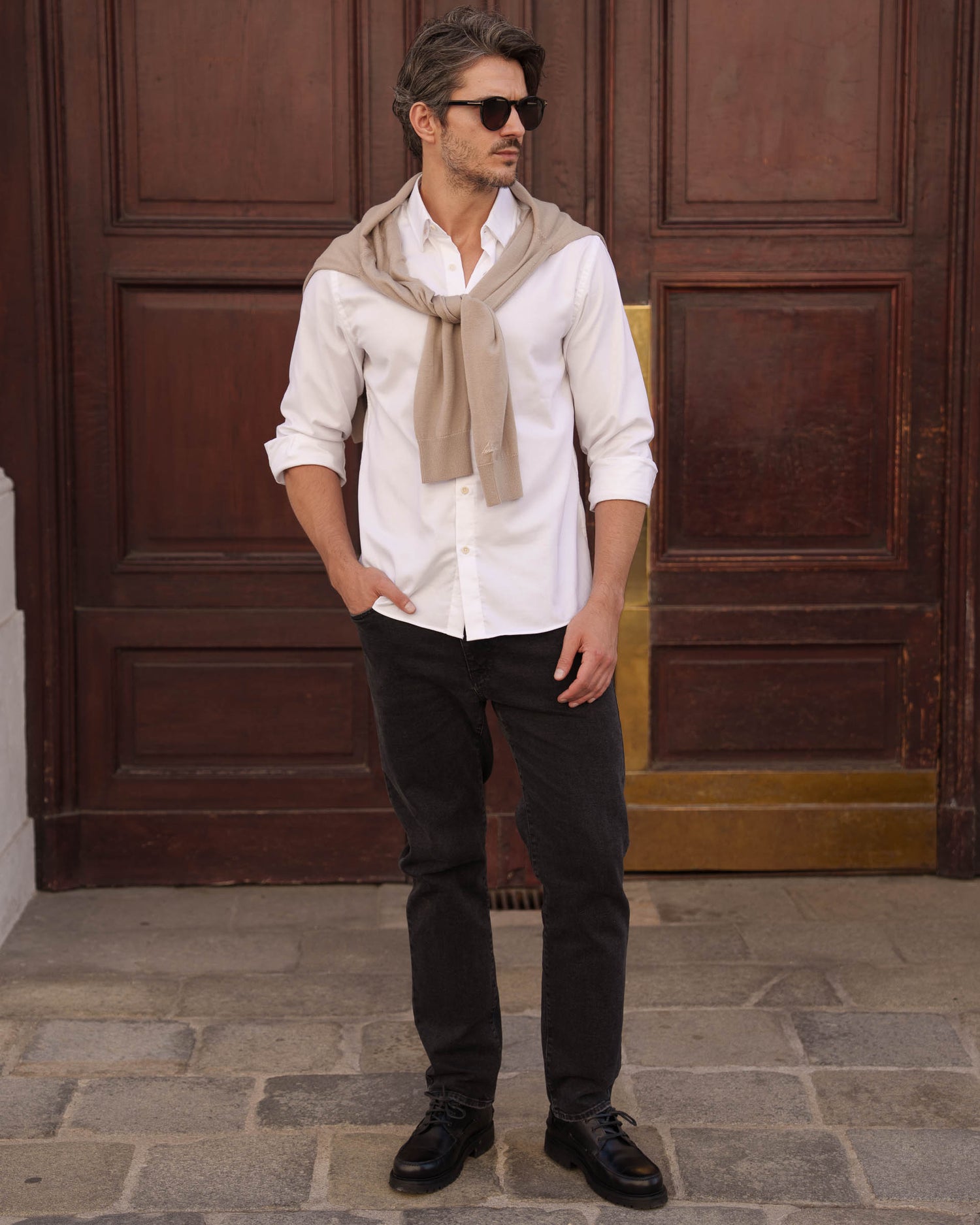 - Collar: Classic turn-down collar with reinforced bar and two invisible buttons for stabilization