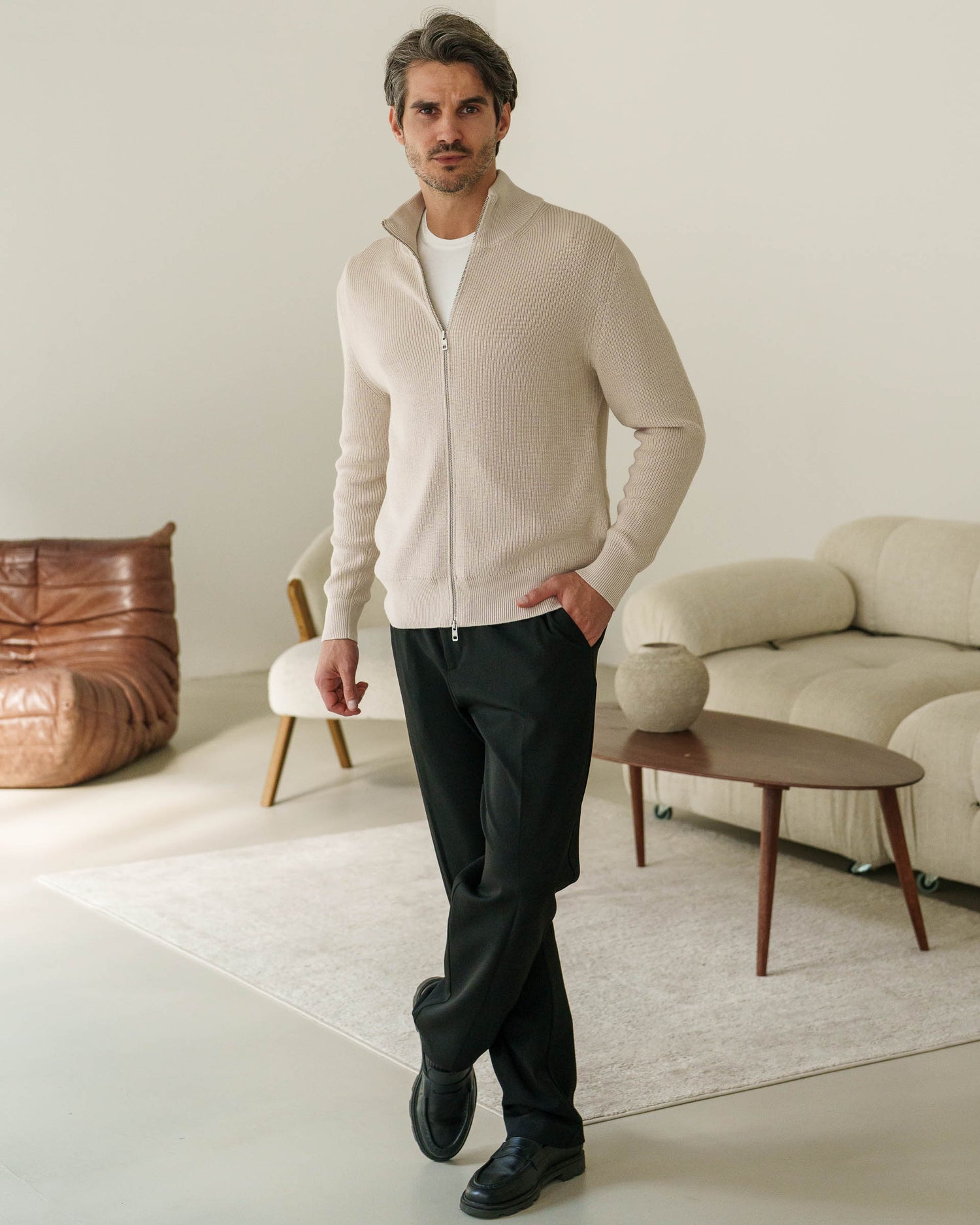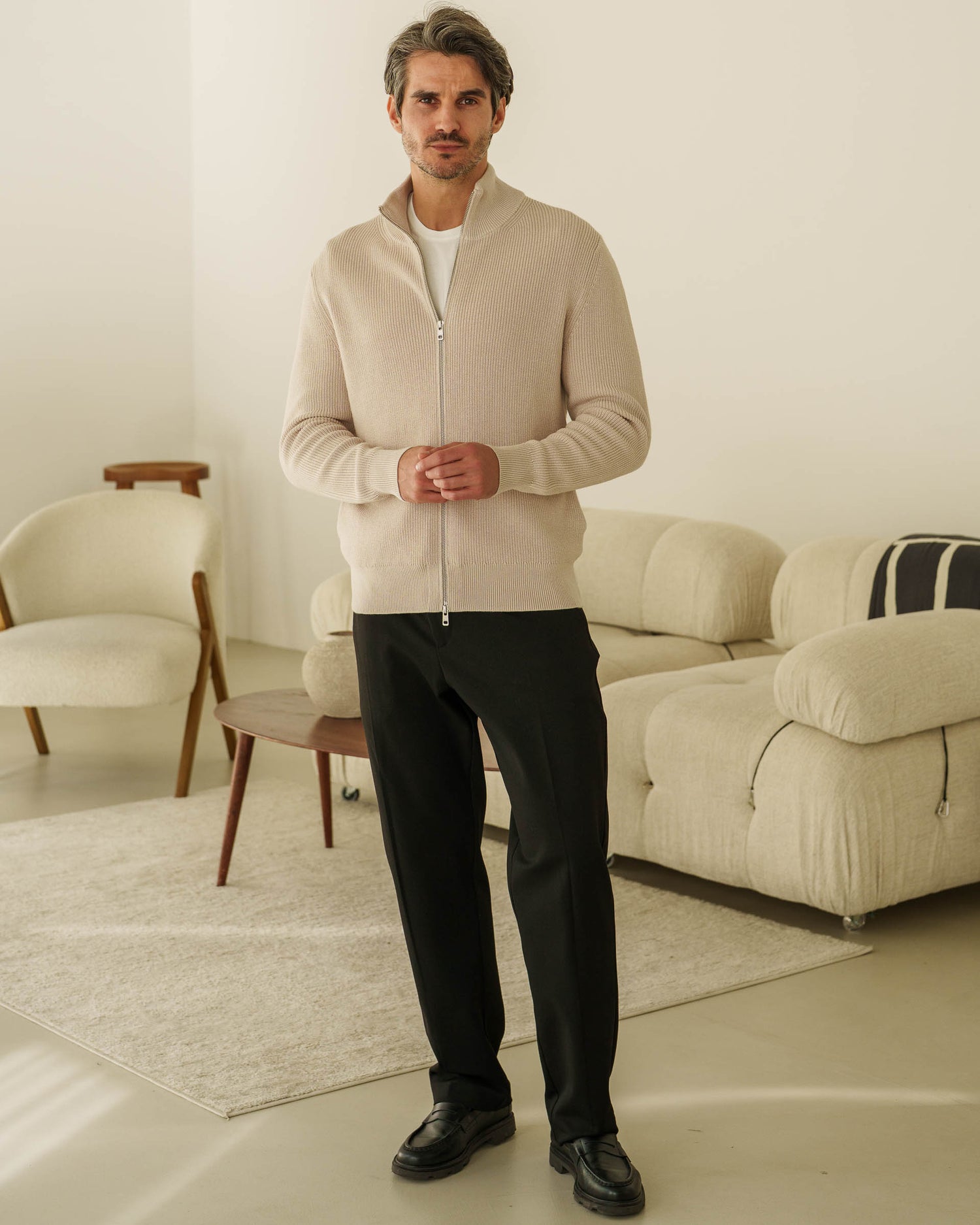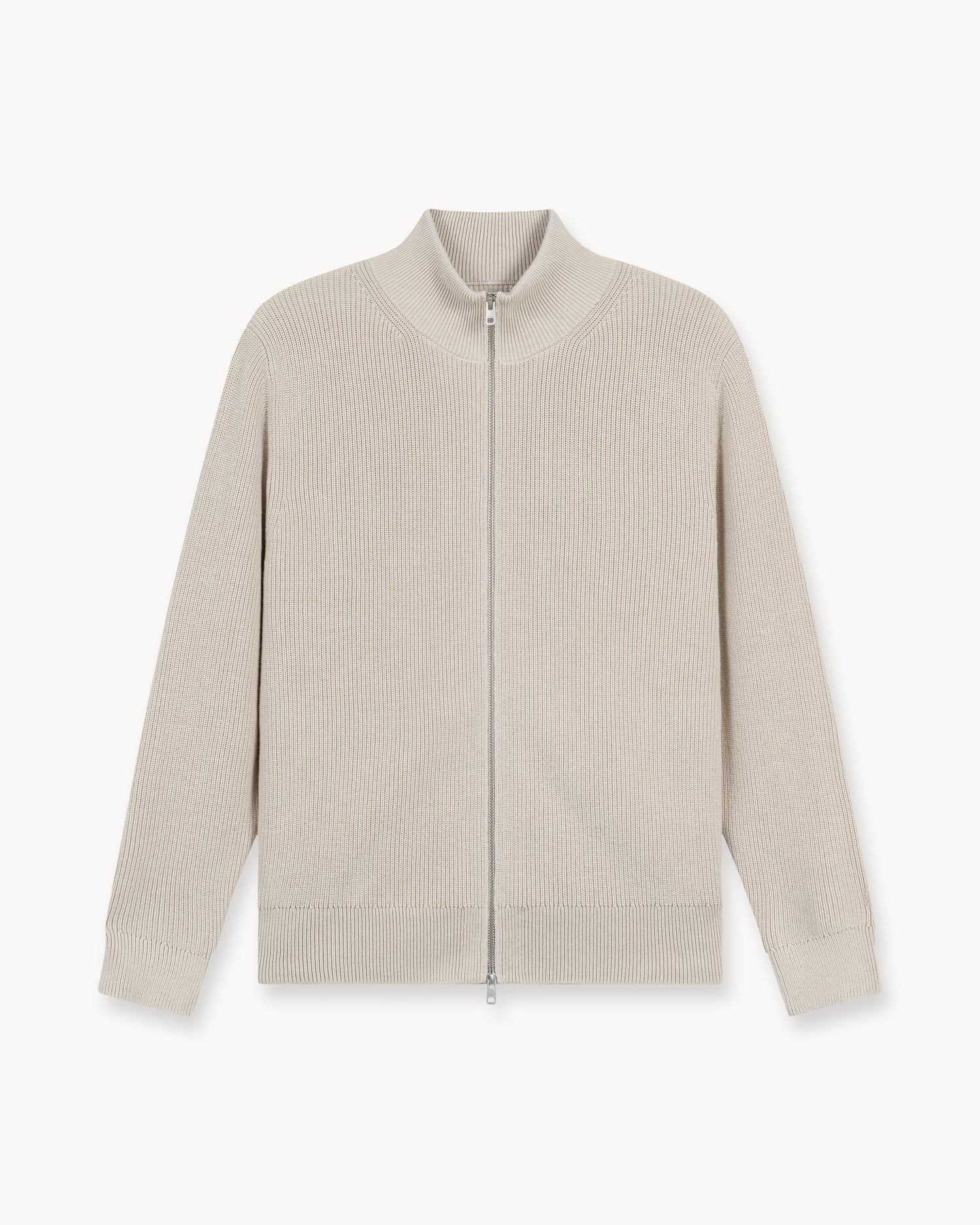 Rib Knit Cardigan – The perfect everyday sweater. The medium-weight rib knit provides an interesting look and ensures good shape retention. The material composition ensures a luxuriously soft feel and exceptional comfort. With its high collar and practical two-way zipper, it's the ideal layering piece for business looks and stylish everyday wear.