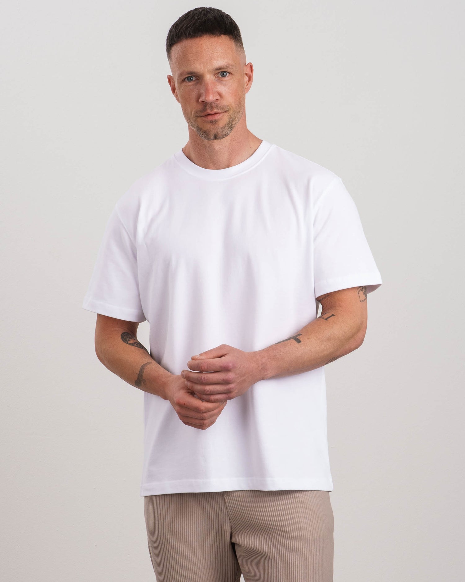 Nimm ein T-Shirt aus deinem Kleiderschrank, das dir perfekt passt, und miss die angegebenen Maße gemäß der Abbildung. Wähle anschließend die Größe, deren Maße am besten mit denen deines Referenz T-Shirts übereinstimmen.