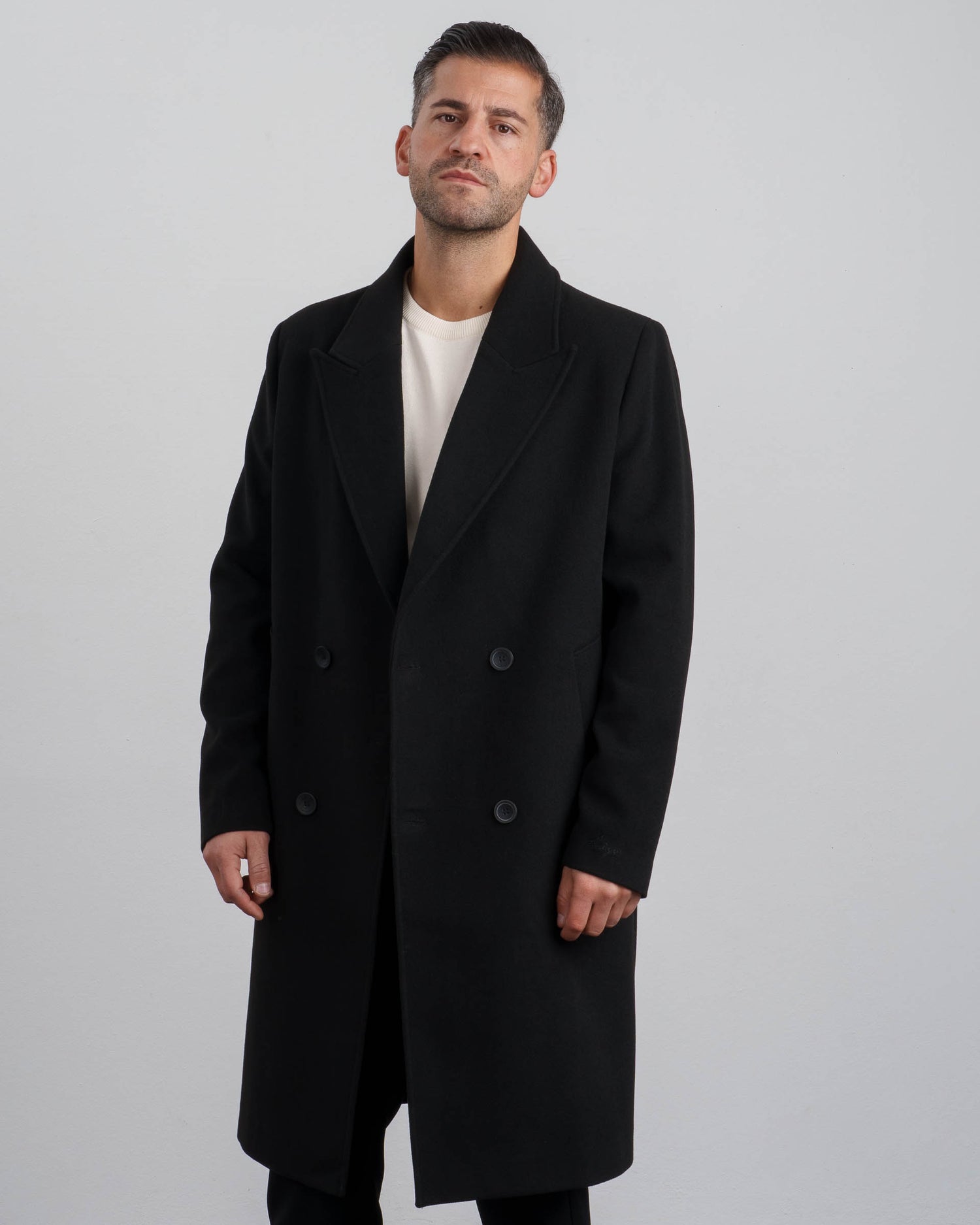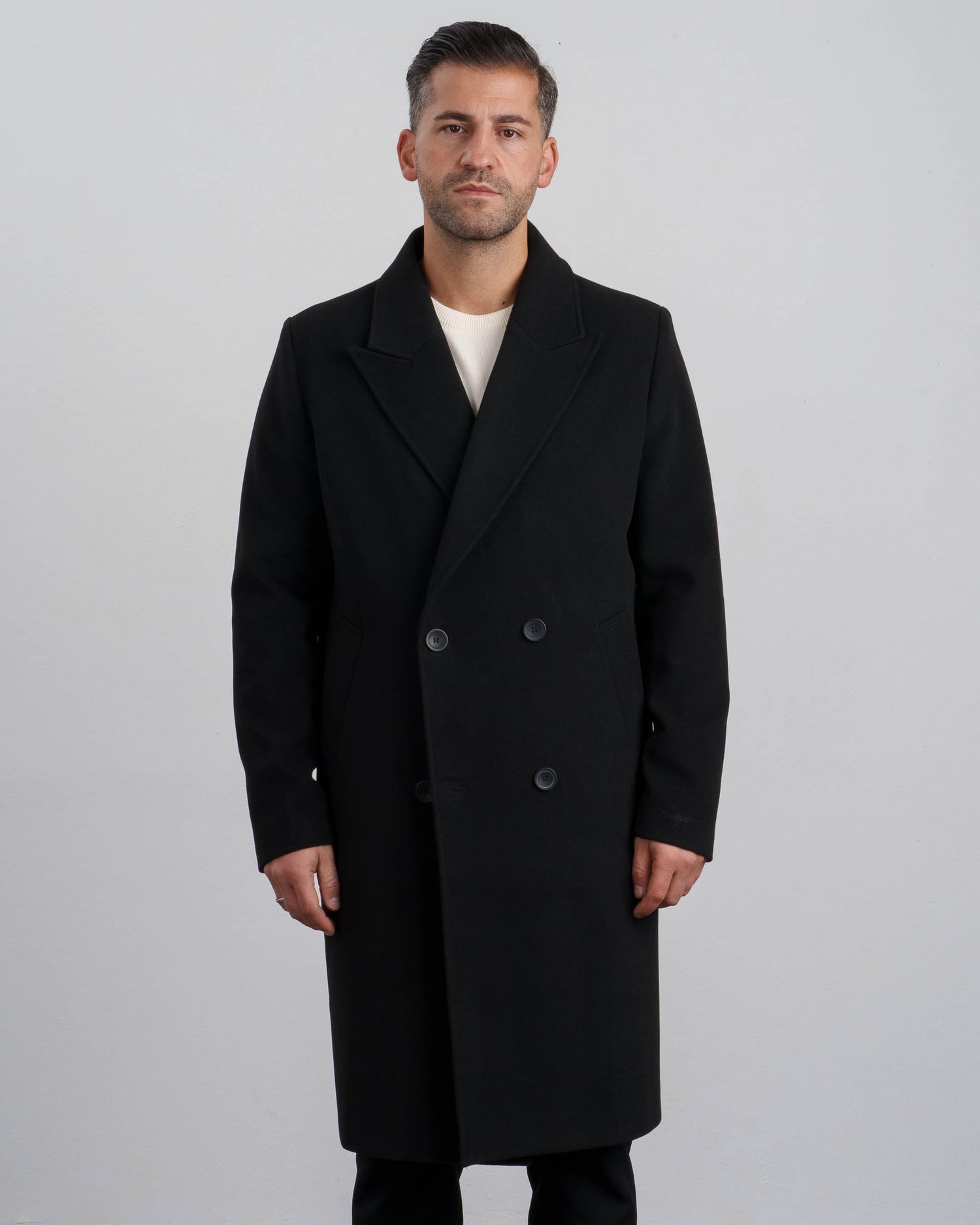 - Zweireihiger Verschluss mit vier gebrandeten Knöpfen