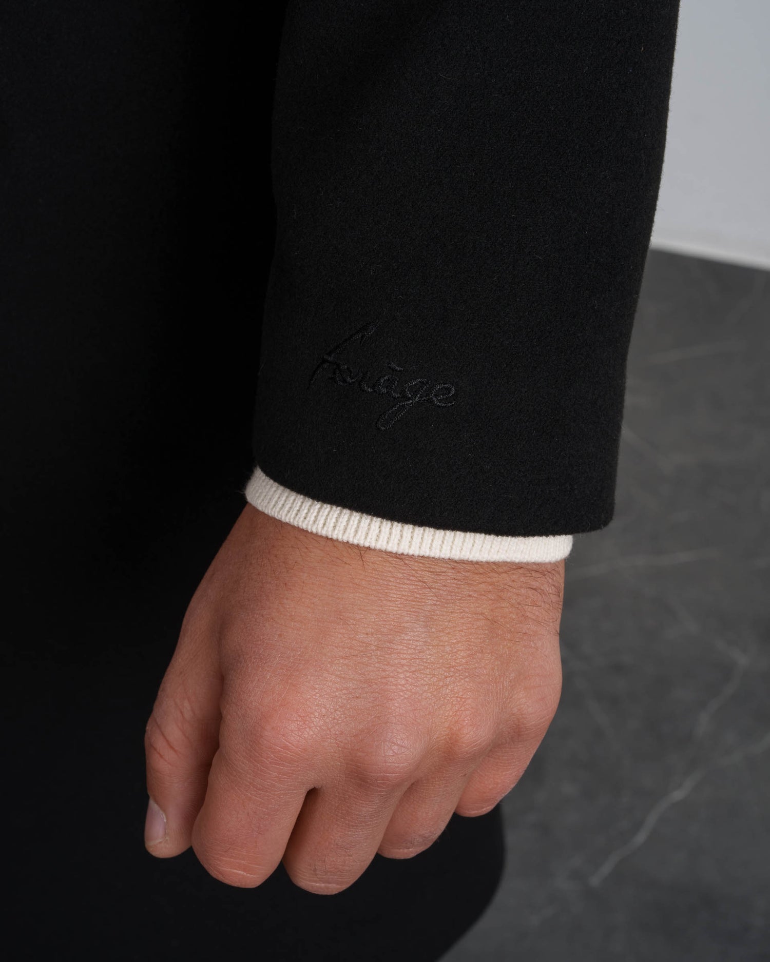 - FORÀGE-Stickerei auf dem linken Handrücken