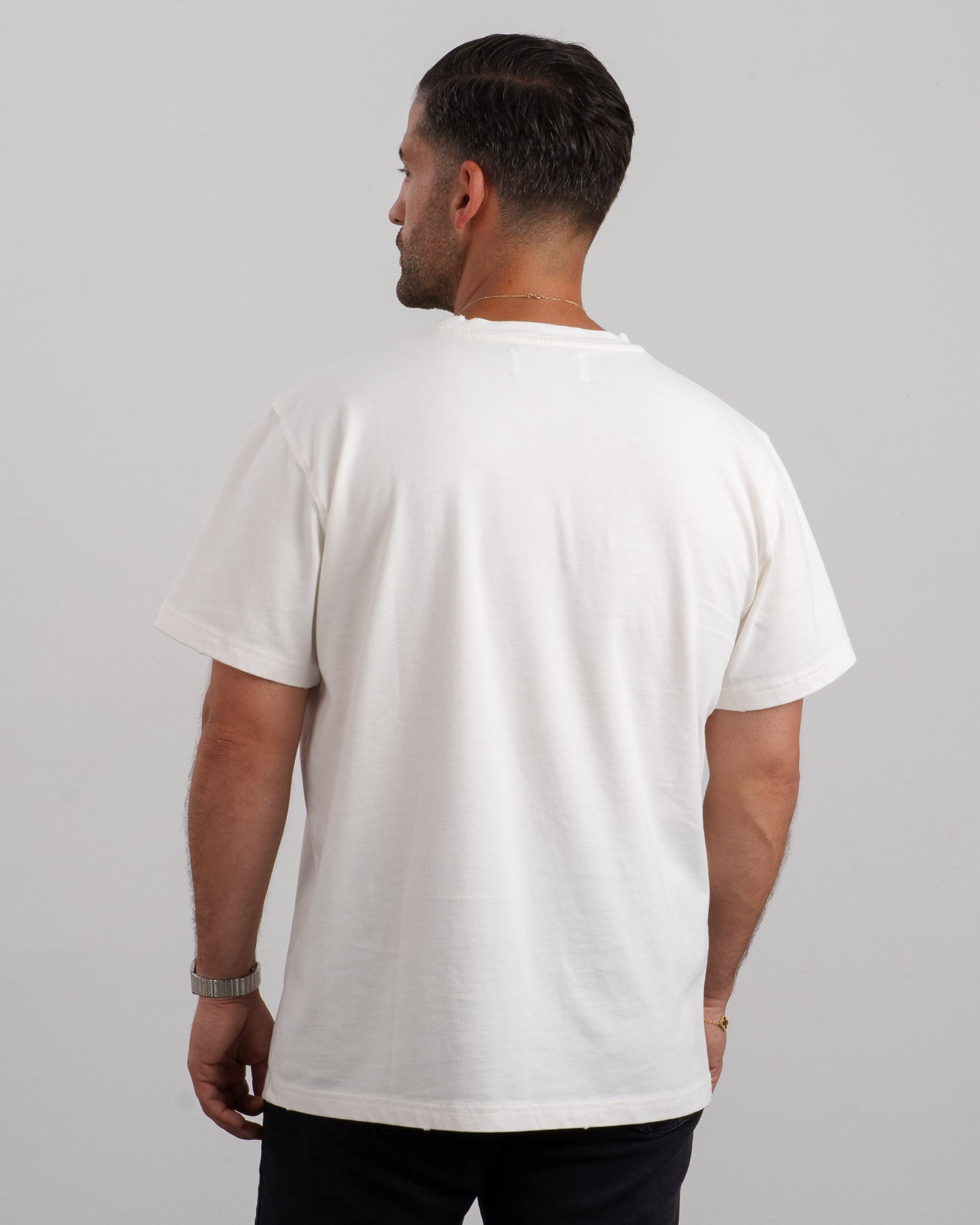 Nimm ein T-Shirt aus deinem Kleiderschrank, das dir perfekt passt, und miss die angegebenen Maße gemäß der Abbildung. Wähle anschließend die Größe, deren Maße am besten mit denen deines Referenz T-Shirts übereinstimmen.