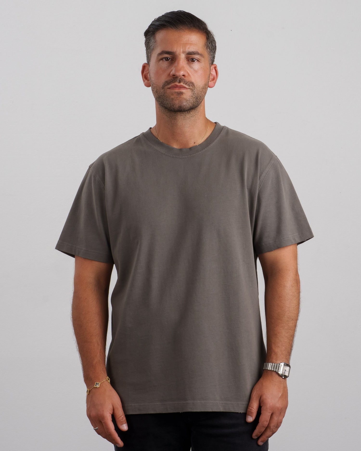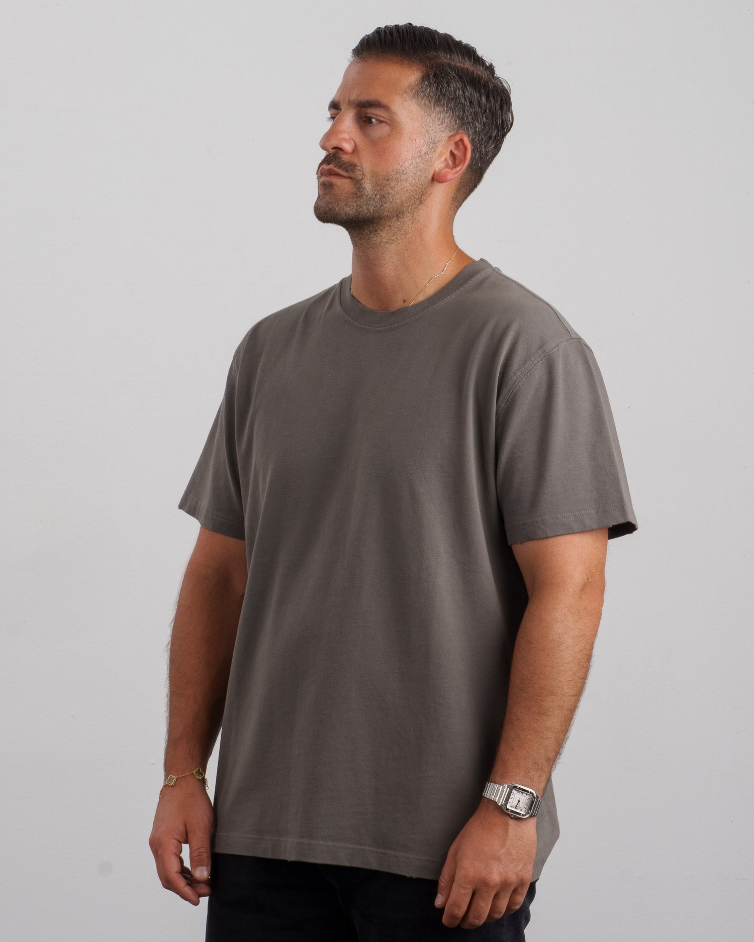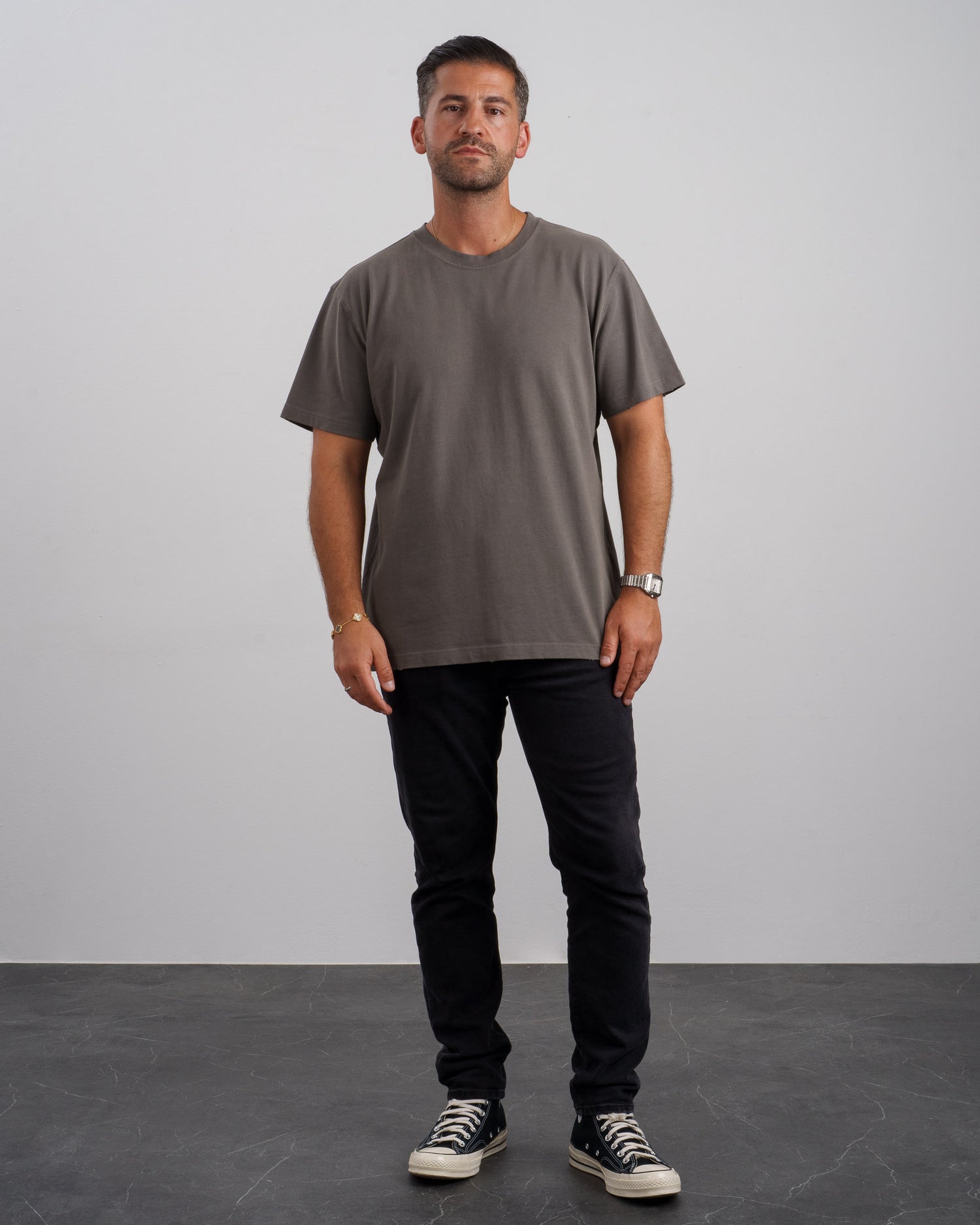 Nimm ein T-Shirt aus deinem Kleiderschrank, das dir perfekt passt, und miss die angegebenen Maße gemäß der Abbildung. Wähle anschließend die Größe, deren Maße am besten mit denen deines Referenz T-Shirts übereinstimmen.